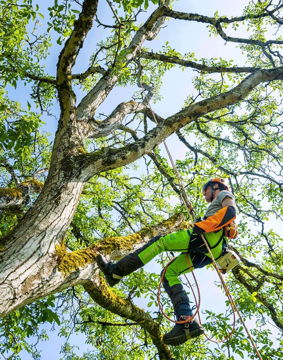 Asian man cutting trees using an electrical chainsaw